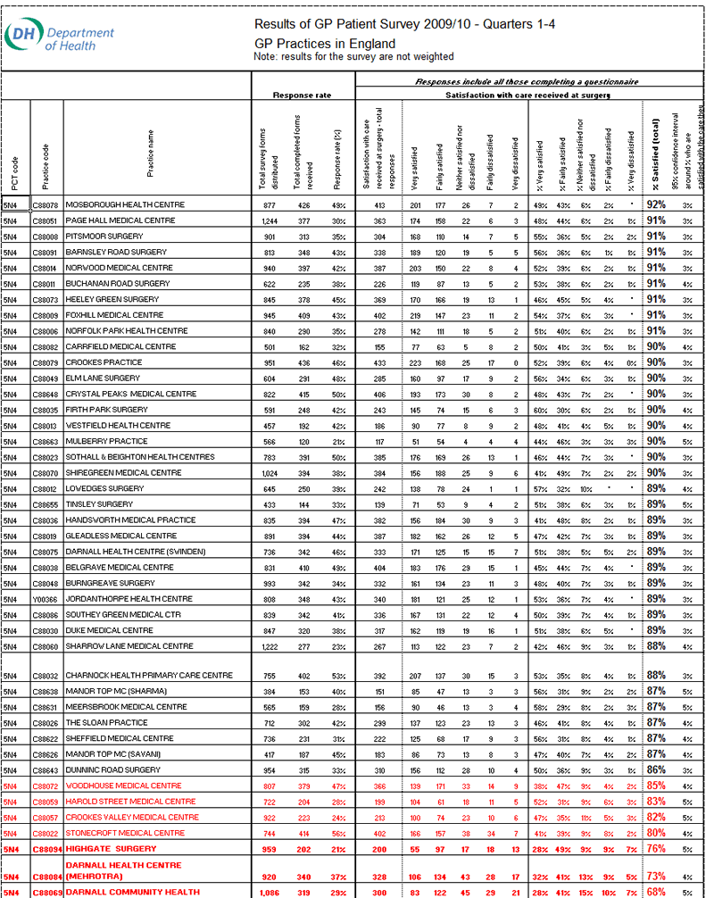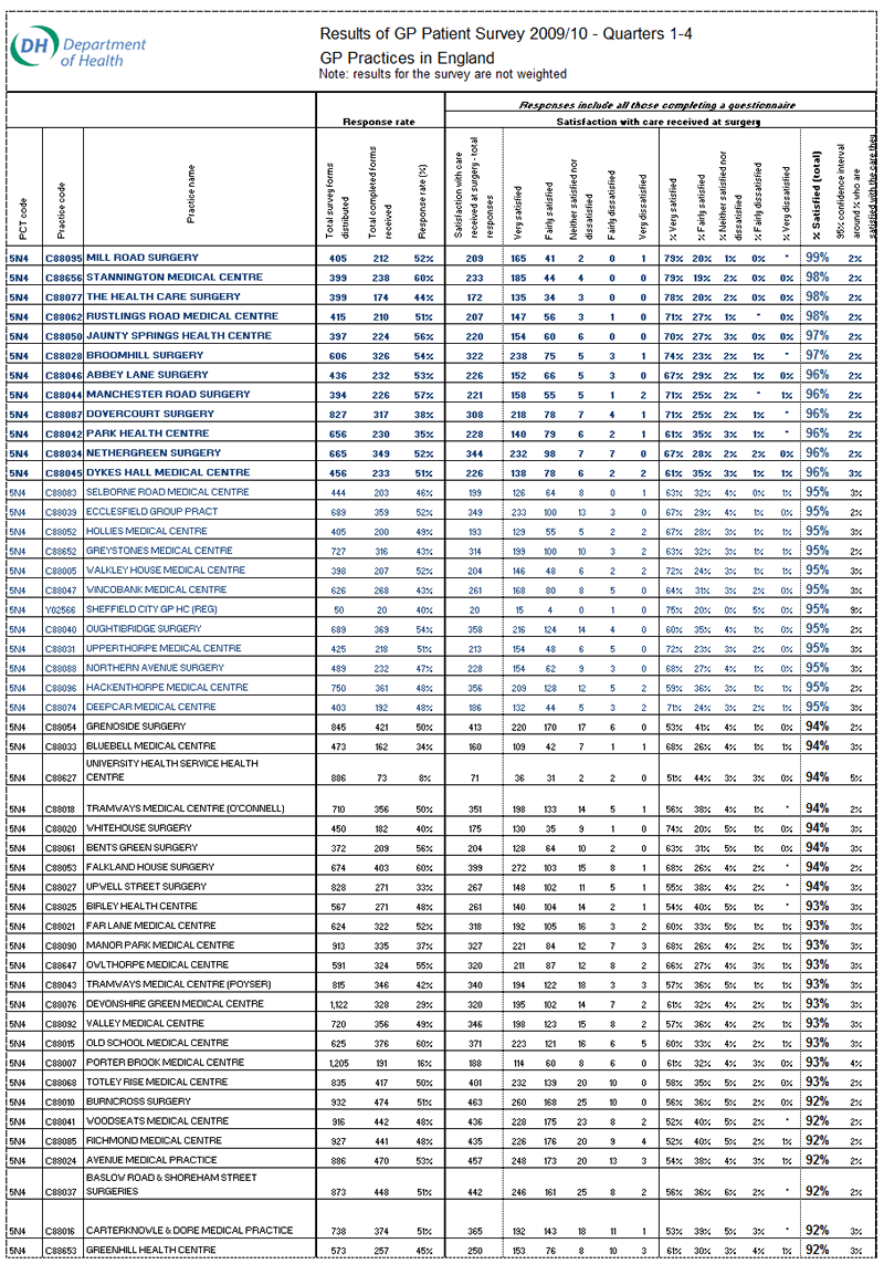 The following table lists all 92 Sheffield GP surgeries ranked in order of patient overall satisfaction of care received. The results for the year 2010-11 will be released during summer 2011.
