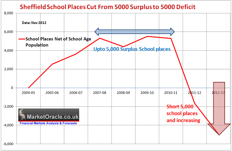 The impact of these cuts in child places in effect reverses the picture of more than a decade earlier when most of Sheffield's children could have expected to receive a place at their school of their choice at the application stage, with even more accepted on appeal, this was as the below graph illustrates by virtue of the fact that for many years Sheffield had a surplus of 5,000 school places (about 5%). However, over the past 2 years deep cuts in the budget in real terms has reversed the situation from an estimated 5,000 surplus places to a deficit of 5,000 places as of 2012-13, i.e. a cut of 10,000 school places through school closures and reductions in the number of classes running at exiting schools, against that which were available during 2010-11, the consequences of which is that schools are being effectively stuffed full to the rafters with the number of children per class now far exceeding the recommended guidelines for maximum class sizes which is resulting in the lack of school places at even catchment area schools.