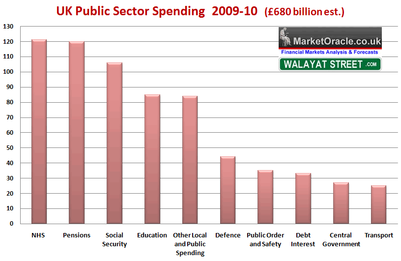 Even if all of the proposed cuts detailed in the earlier analysis (UK Public Spending Deficit Debt that Risks Bankrupting Britain ) did take place, Britain would still be in for tough times during the next 5 years. However without cutting the big spending budgets then there is no way the country can bridge the huge deficit where each months deficit is added to Britians' debt mountain the size of which would risk a currency and economic collapse into hyper-inflation Iceland style.
