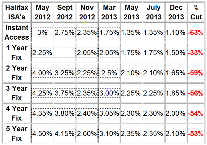 The below table for the cash isa rates as offered by the Halifax shows that savings interest rates crashed directly in response to the Bank of England's Funding for Lending Scheme announced in July 2012, which sought to provide the Banks with cheap money to encourage lending to the general public that originally would total an estimated £80 billion over 18 months but which subsequently was indefinitely extended. The effect of which has been for the Banks to rely on Bank of England / UK Treasury for funding of lending instead of savings and thus savings interest rates continue to crash despite a strengthening economy.