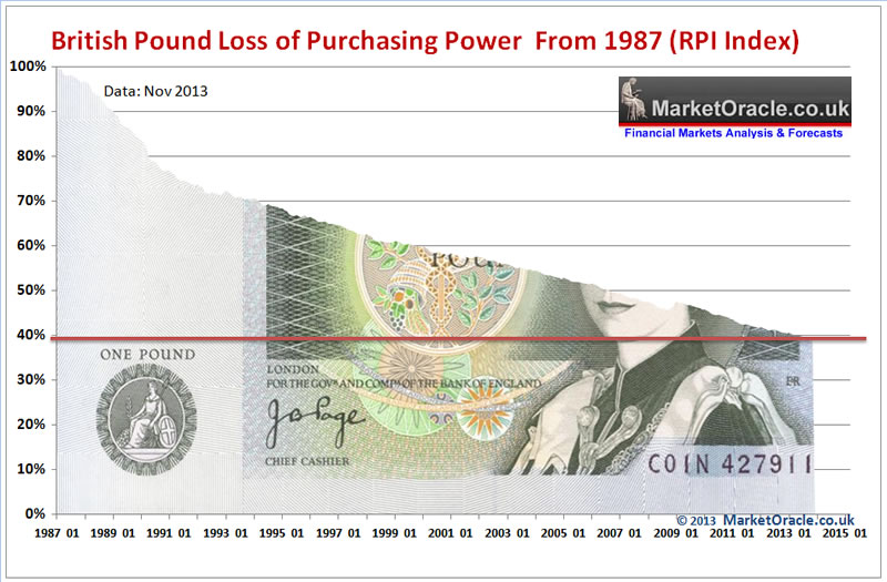 The below graph again illustrates how much Inflation we have experienced that most people are likely unaware of is that of the loss of purchasing power of the British Pound which is now worth less than 40% of its value of 25 years ago as governments continue to relentlessly erode its value all the way towards zero.