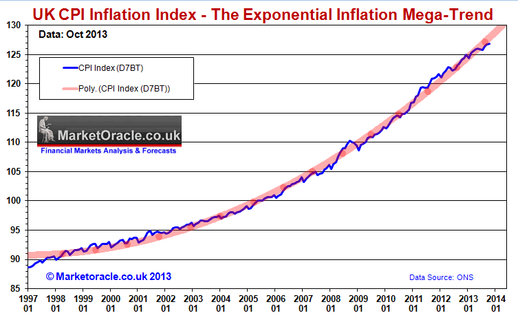 Introduction: This analysis is part 2 of 2 that seeks to conclude in a detailed trend forecast for UK house prices that extends my existing forecast into Mid 2014 to the end of 2018, thus a 5 year forecast for UK house prices 2014-2018. This analysis is focused on the impact of the Inflation mega-trend on the prospects for UK house prices that concludes in a detailed trend forecast and its implications for outcome of the next general election.