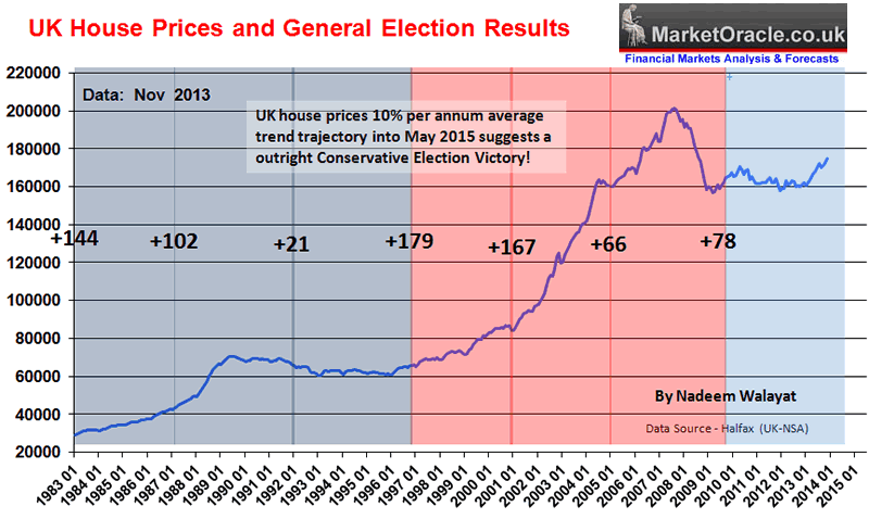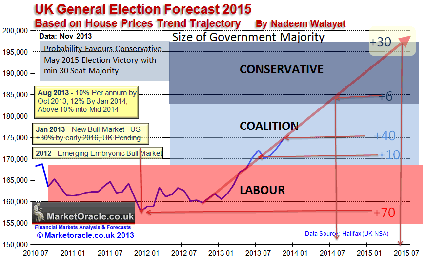 In terms of the 'fixed' May 2015 general election, the implications of 10% per annum house price inflation for another 18 months, that builds on the housing bull market of the previous 12 months and on the embryonic bull market of 2012 are that probability strongly favours an outright Conservative election victory.