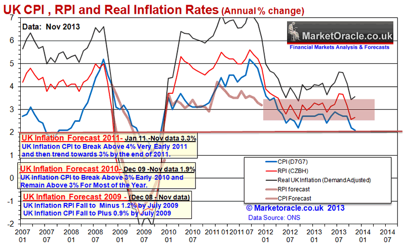 The latest inflation data shows CPI falling to 2.1% for November 2013 (RPI 2.6%, Real inflation 3.6%) which was received as good news as inflation was finally starting to home in on the Bank of England's 2% CPI target rate. This prompted the usual mantra amongst the academics of the risks of dis-inflation and in some cases even deflation which were coupled with benign inflation forecasts by government institutions such as the Bank of England and the OBR that repeated their forecast that UK inflation would resolve to 2% in 2years time that is always the case and I mean ALWAYS, for more than a decade now the Bank of England has been spouting the same mantra aimed at keeping the wage slaves sedated as the actual inflation graph below illustrates that in reality there is an over 90% probability for UK Inflation being significantly above 2% in 2 years time.